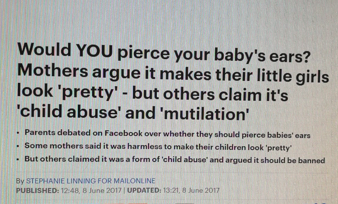 “Perforarías las orejas de tu bebé? Hay madres que dicen que hacen a sus nenas más ‘lindas’ – pero otras afirman que es ‘abuso infantil’ y ‘mutilación'”.