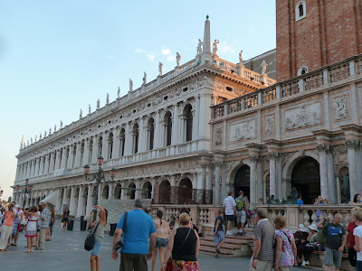 A la izquierda está la Biblioteca Marciana, del siglo XVI, que alberga manuscritos griegos y latinos. Y al final de este edificio está la Campanile, una torre a la cual se puede subir y se tiene una vista preciosa de la ciudad.