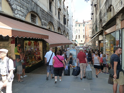 Llegamos a la zona del Ponte di Rialto que es un enjambre de turistas. Ves hordas y hordas, la mayoría siguiendo a un guía o muchos otros escuchando mp3 de visitas guíadas, podés darte cuenta que muchos han bajado de los cruceros por el día.