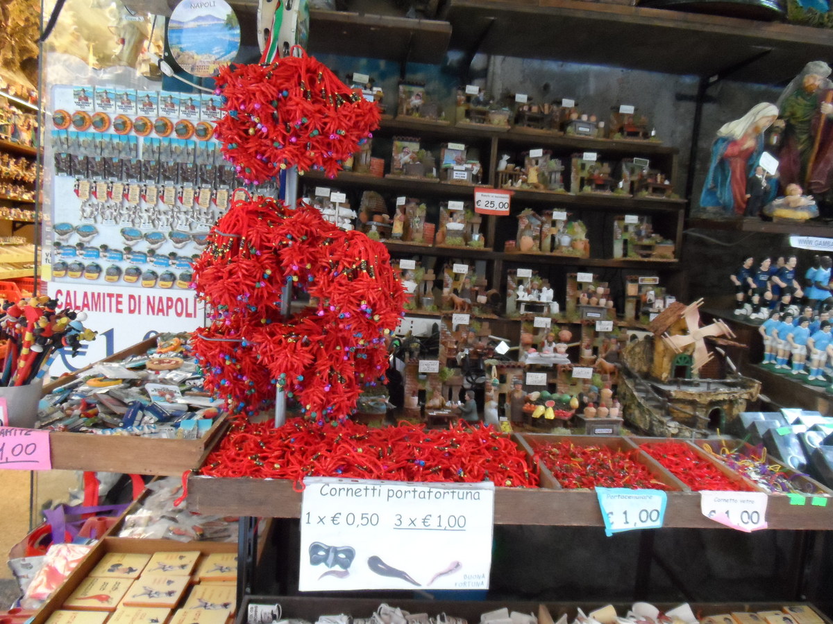 También los cuernos rojos, amuletos de la buena suerte, descendientes de los amuletos fálicos de Pompeya.