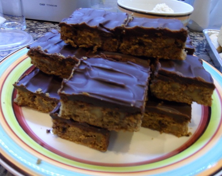 – Cuatro traybakes, uno de dulce de leche, dos de chocolate y otro de limón. (Ah, sí, ahora están de moda los traybakes que es hornear una torta o tarta en un molde rectangular y cortarlos en cuadraditos!)