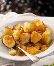 1. Precalentar el horno a 190°C. Cortar las papas y ponerlas en agua bien fría. Luego hervirlas, colarles el agua y agrearlas a la olla. Calentarlas por 1-2 minutos para secarlas un poco. Mientras, poner la grasa o el aceite en una bandeja y calentarlo por 5 – 10 minutos.