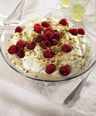 2. Con una batidora eléctrica, batir el mascarpone y flan o postre de vainilla hasta que quede una mezcla homogénea. Agregar esta mezcla sobre las frambuesas. Batir la crema y agregarla a la mezcla anterior. Decorar con los pistachios y las frambuesas que fueron reservadas.