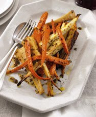 1. Calentar el horno a 220°C. Calentar una fuente en el horno y mientras cortar las zanahorias y nabos a lo largo.
