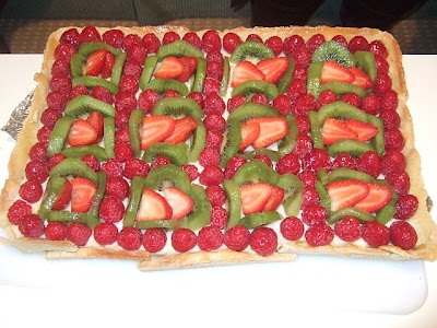 Es una tarta de masa dulce, la base bien crocante y luego se unta con crema pastelera (que también hice) y arriba le puse frutillas, kiwis y frambuesas.